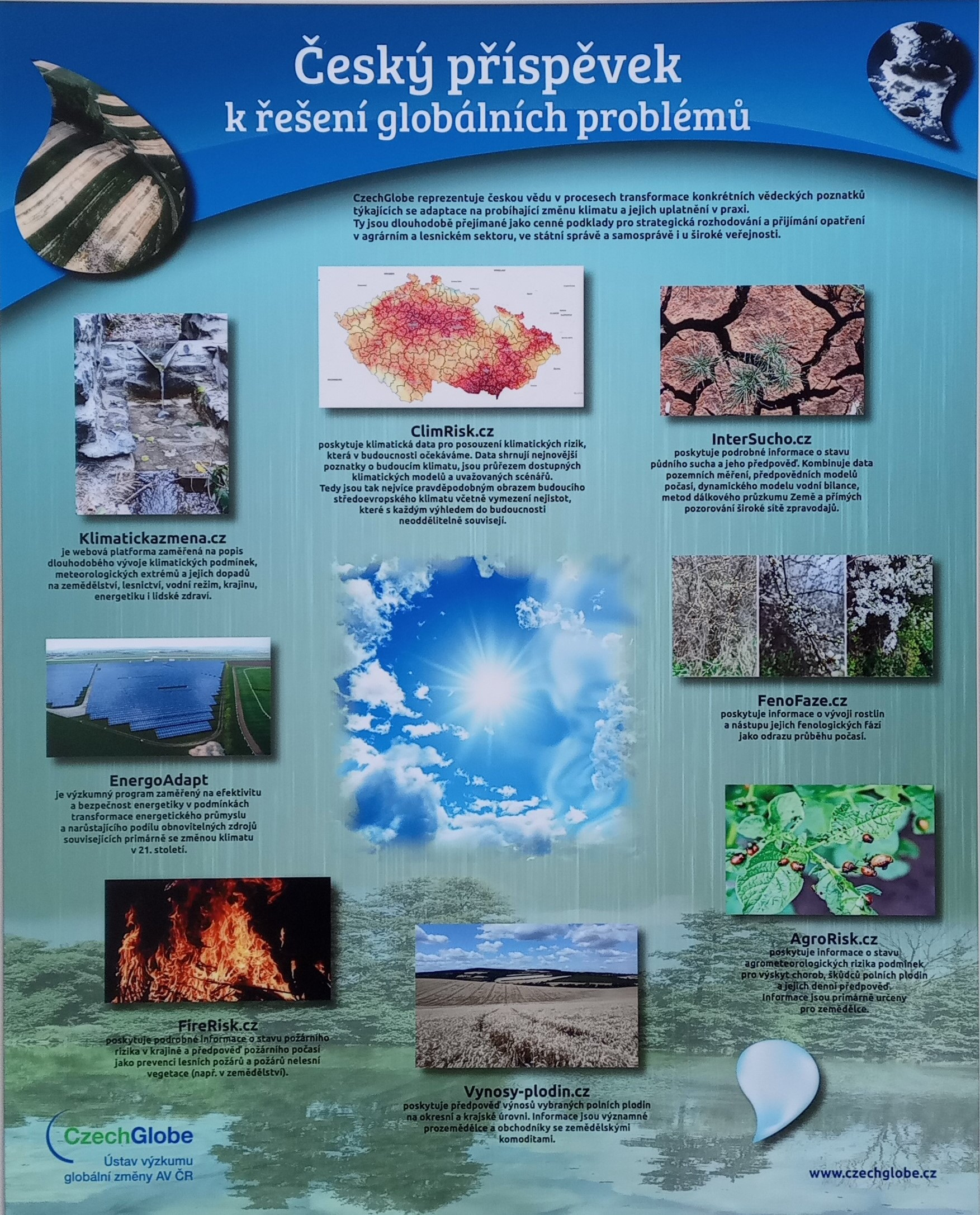 Výstava poukazuje na klimatické změny, které způsobují, že vody v přírodě ubývá. Příroda a krajina jsou přitom jedinými zdroji, z nichž je možné vodu čerpat.Šestý ročník výstavy, kterou připravuje Ústav výzkumu globální změny AV ČR, v. v. i., s dalšími institucemi (Česká geologická služba, Český hydrometeorologický ústav, Fakulta rybářstí a ochrany vod Jihočeské univerzity v Českých Budějovicích, Mezinárodní komise pro ochranu Labe, Ministerstvo zemědělství, Povodí Vltavy, s. p., Výzkumný ústav meliorací na ochrany půdy, v. v. i., Výzkumný ústav vodohospodářský T. G. Masaryka, v. v. i.).